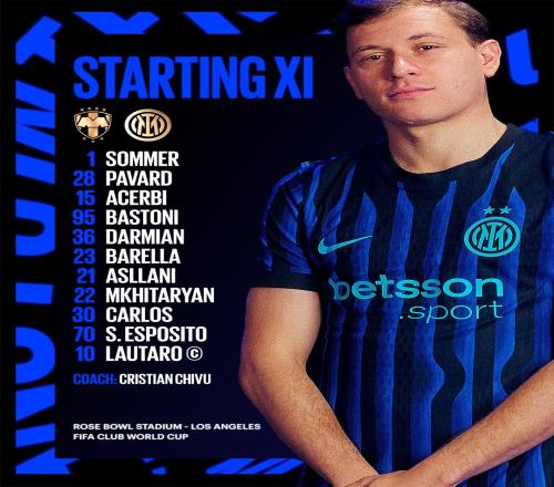 国米首发:1-索默、15-阿切尔比、28-帕瓦尔、30-卡洛斯-奥古斯托、36-达米安、95-巴斯托尼、21-阿斯拉尼、22-姆希塔良、23-巴雷拉、10-劳塔罗-马丁内斯、70-S-埃斯波西托